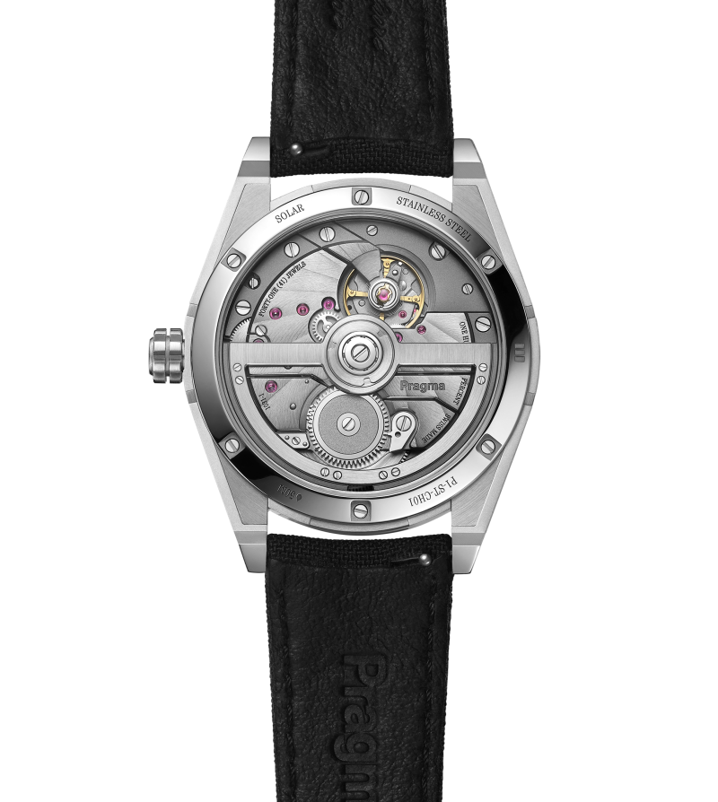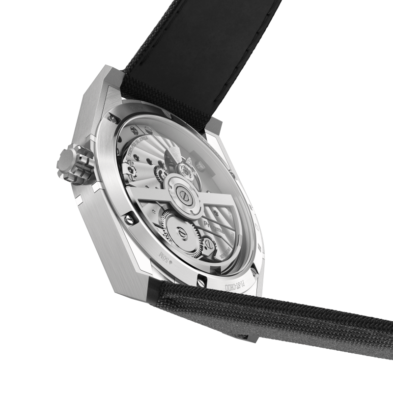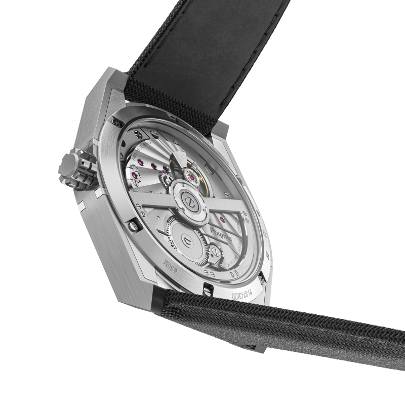 Automatic Certified Chronometer (ISO 3159) movement with hours, minutes, seconds (6 o’clock disk), and date (12 o’clock) displays. Features variable inertia balance and 100% recycled titanium bridges and plates.